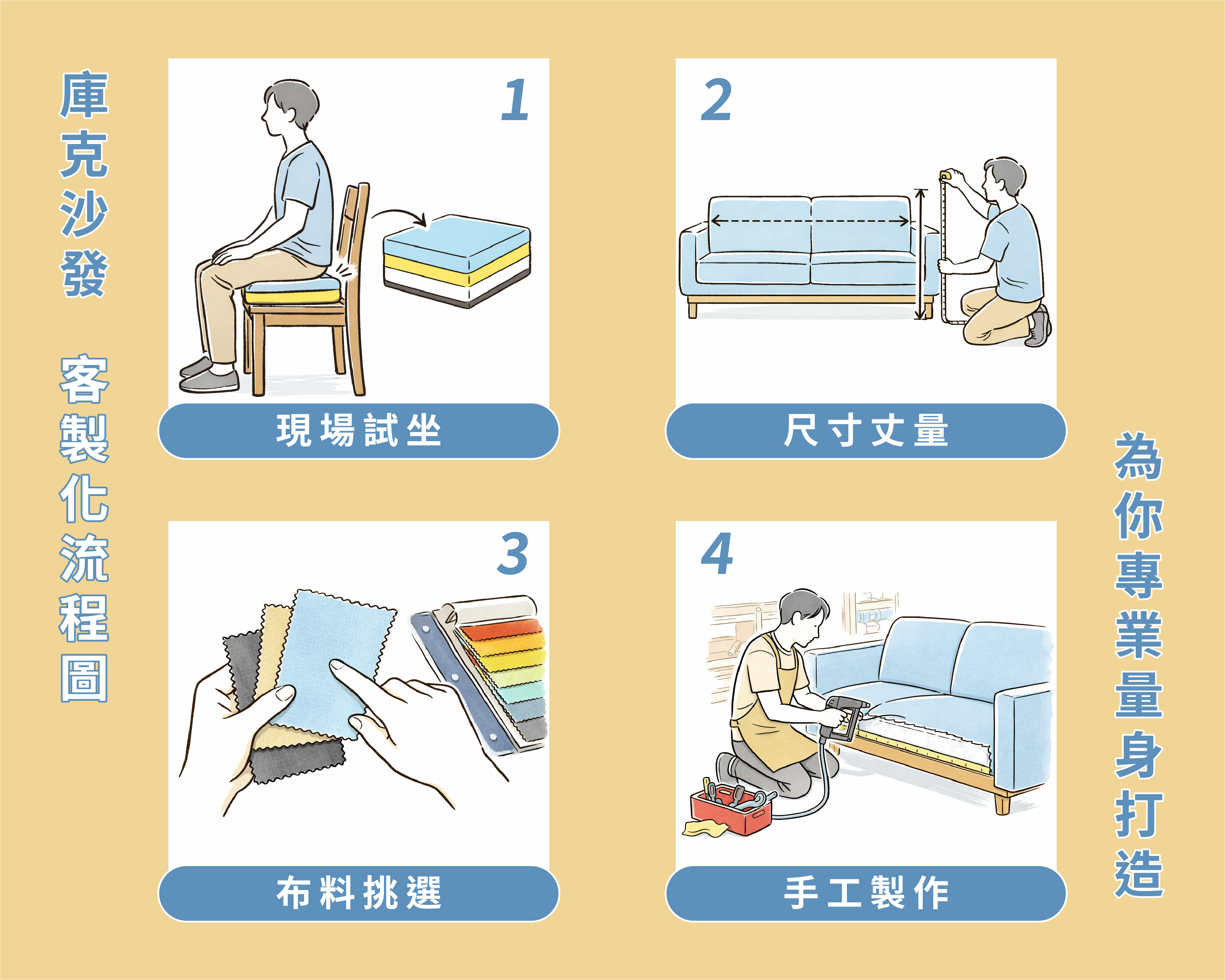 在永康設有旗艦店與直營工廠的雙重優勢,帶來的是三個實質好處:首先,省去中間商的流通成本,將預算直接回饋在更高品質的泡棉與結構材料上;其次,所有材料來源公開透明,從實木骨架到 SGS 認證機能布,每一層都能讓消費者親眼確認;第三,客製化溝通更直接有效率,從量尺、打樣到交貨,全程一條龍服務,省去跨店溝通的落差。