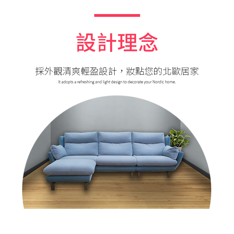 清爽輕盈的設計風格,搭配薄扶手,節省空間且不失雅緻。後背配備高級羽絨靠枕,帶來輕巧舒適的支撐感。布套與底座可選擇跳色設計,讓您自由揮灑色彩,妝點北歐居家風情。