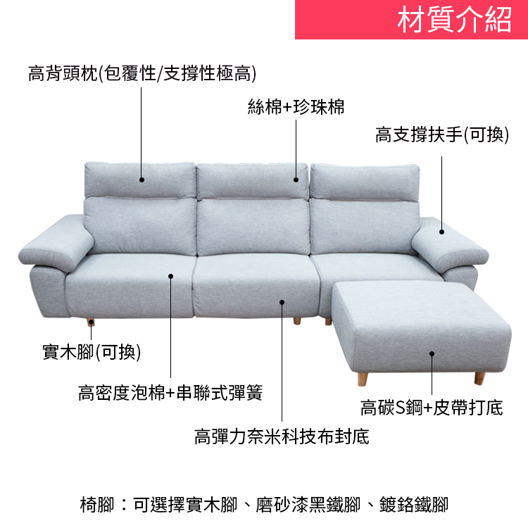 涼感布、皮感布、抗菌布、貓抓皮、貓抓布、貓抓絨、鹿皮絨、機能布、牛皮、有機硅、色織布、亞麻布、家飾布、珍珠絨、皮革、功能布等多樣布料,滿足個性化需求。