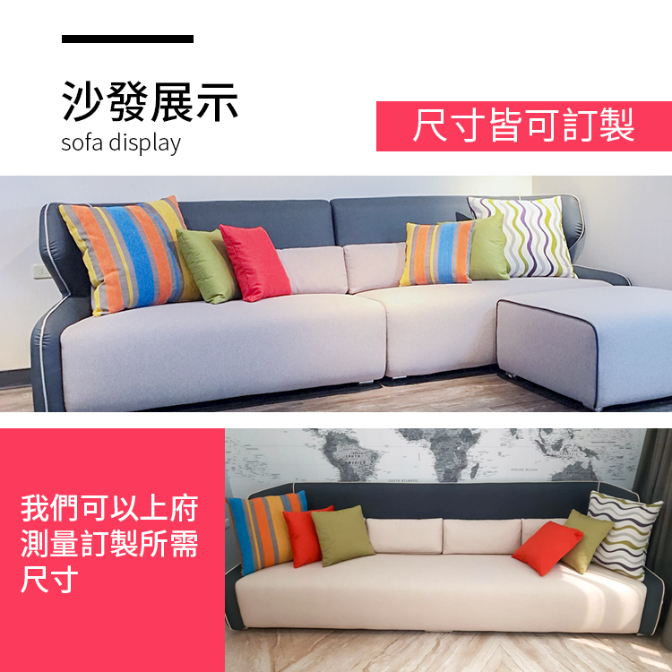 沙發套皆可拆卸清洗,易於保養與清潔,可依需求訂製任意尺寸規格,滿足您的空間需求。表面材質與顏色多樣可選,軟硬度與扶手設計亦可自由調整,貼合您的個人喜好與使用習慣。